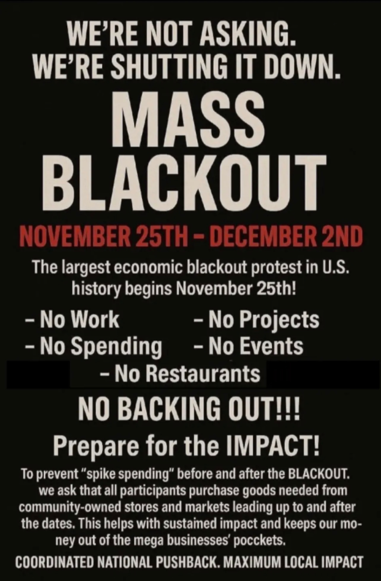 Reminder, boycott in effect for those who celebrate. Support your local community based businesses and establishments as much as possible if you must spend. Remember the goal is to make them know that without us 99%, the 1% go broke.